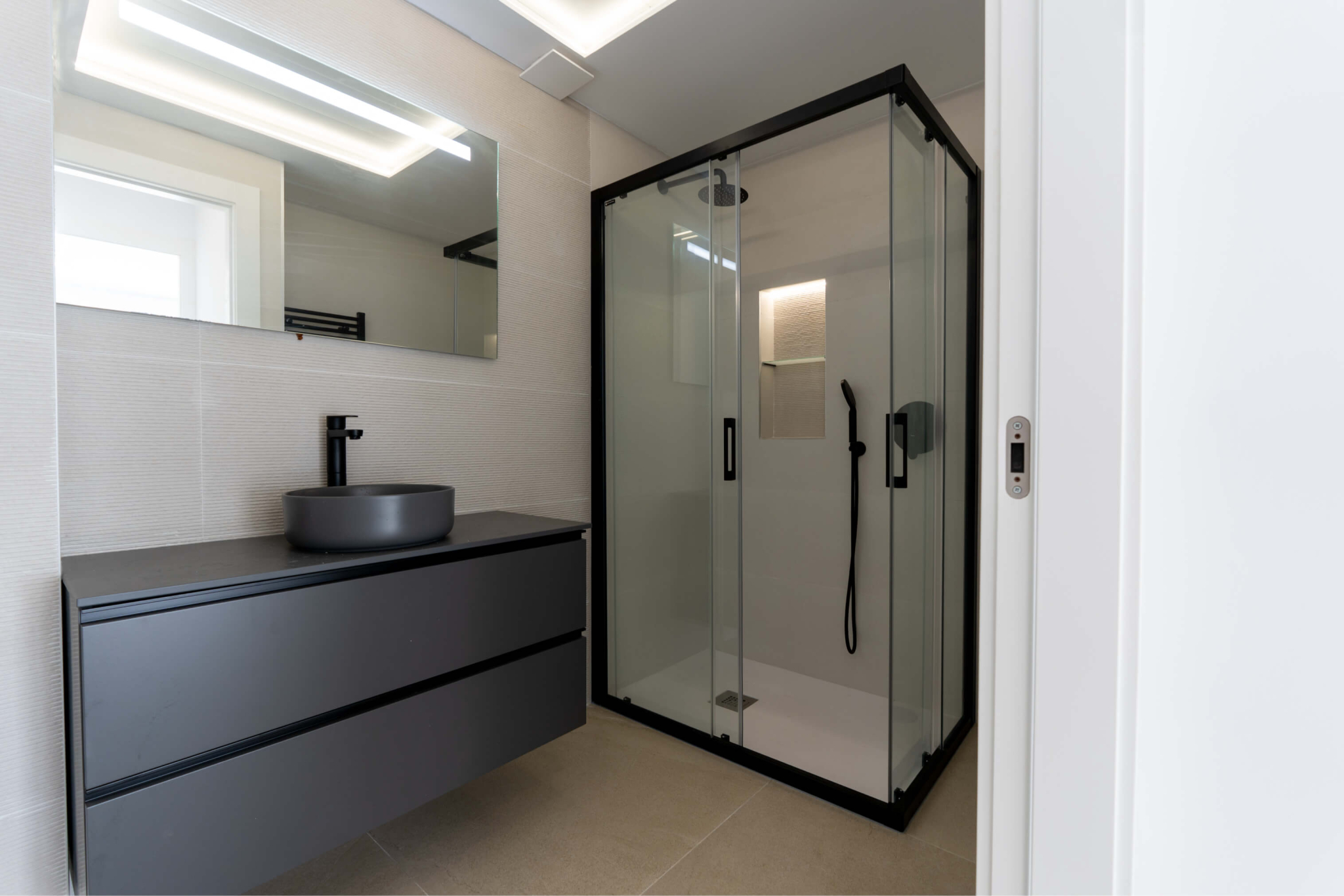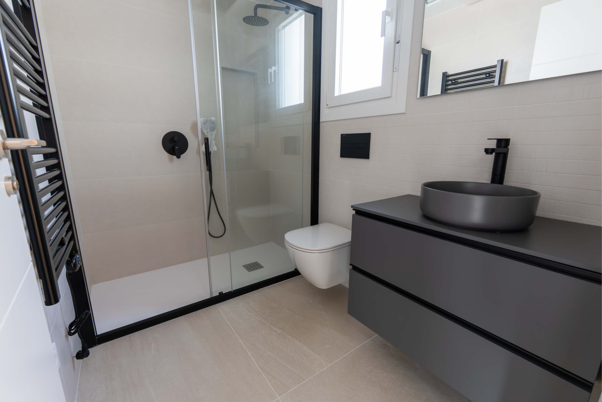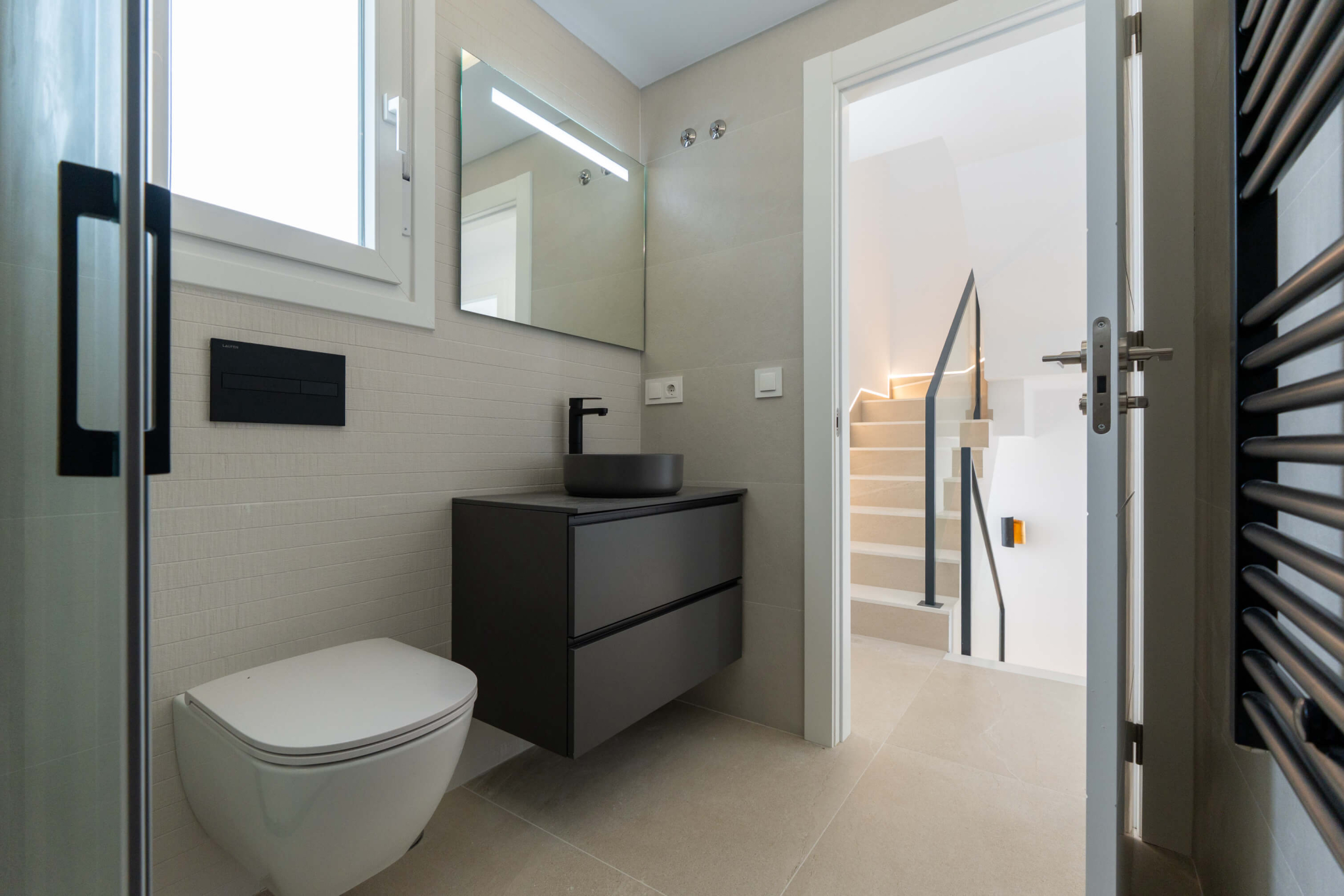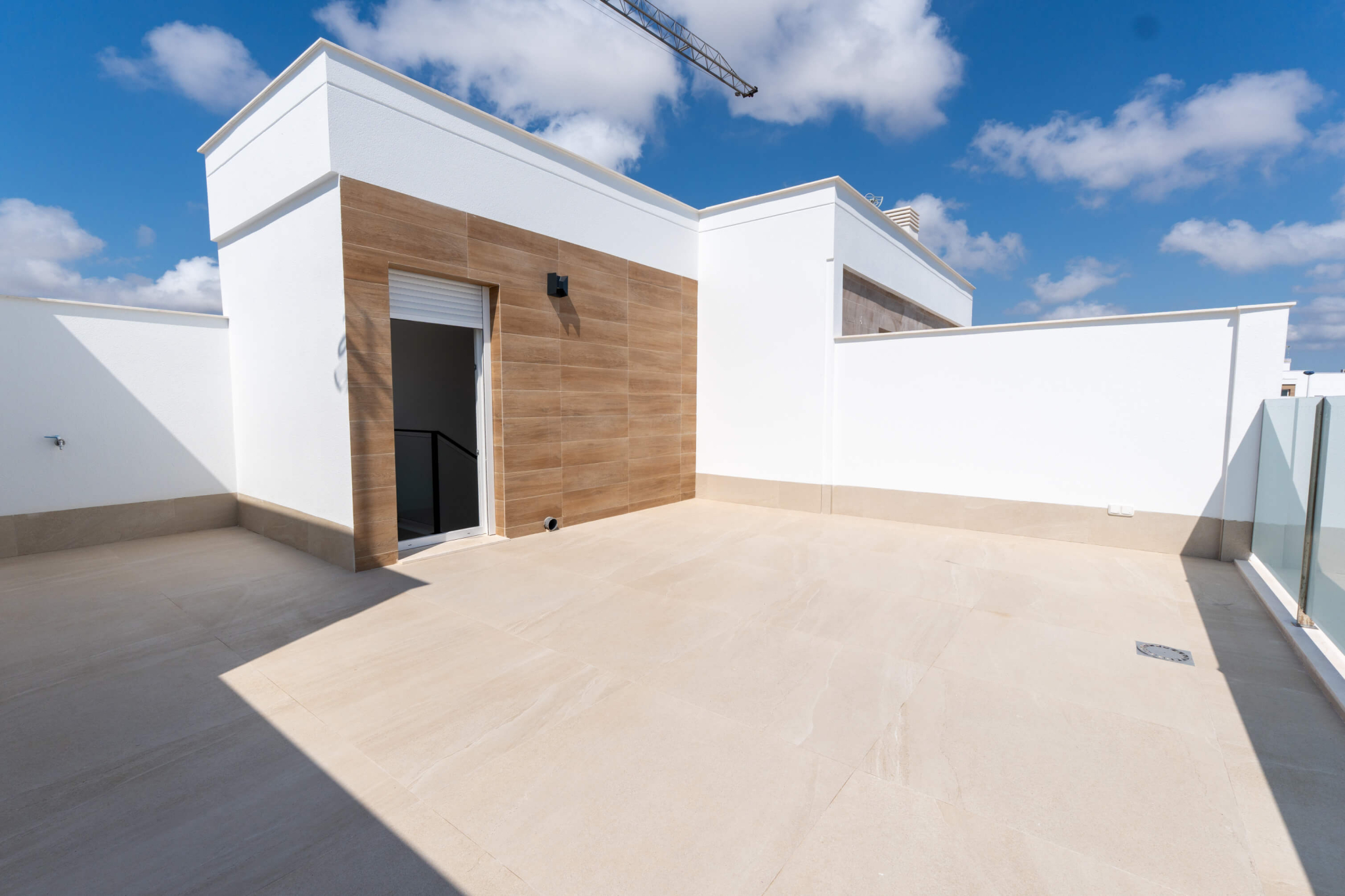 La planta de arriba consta de dos amplios dormitorios, uno con armario empotrado y otro con vestidor y un segundo baño a compartir. Ambos dormitorios tienen acceso a amplias terrazas soleadas. Además la vivienda cuenta con una amplia terraza/ solarium en la azotea con puntos de electricidad y agua para poder disfrutar de las noches de verano.