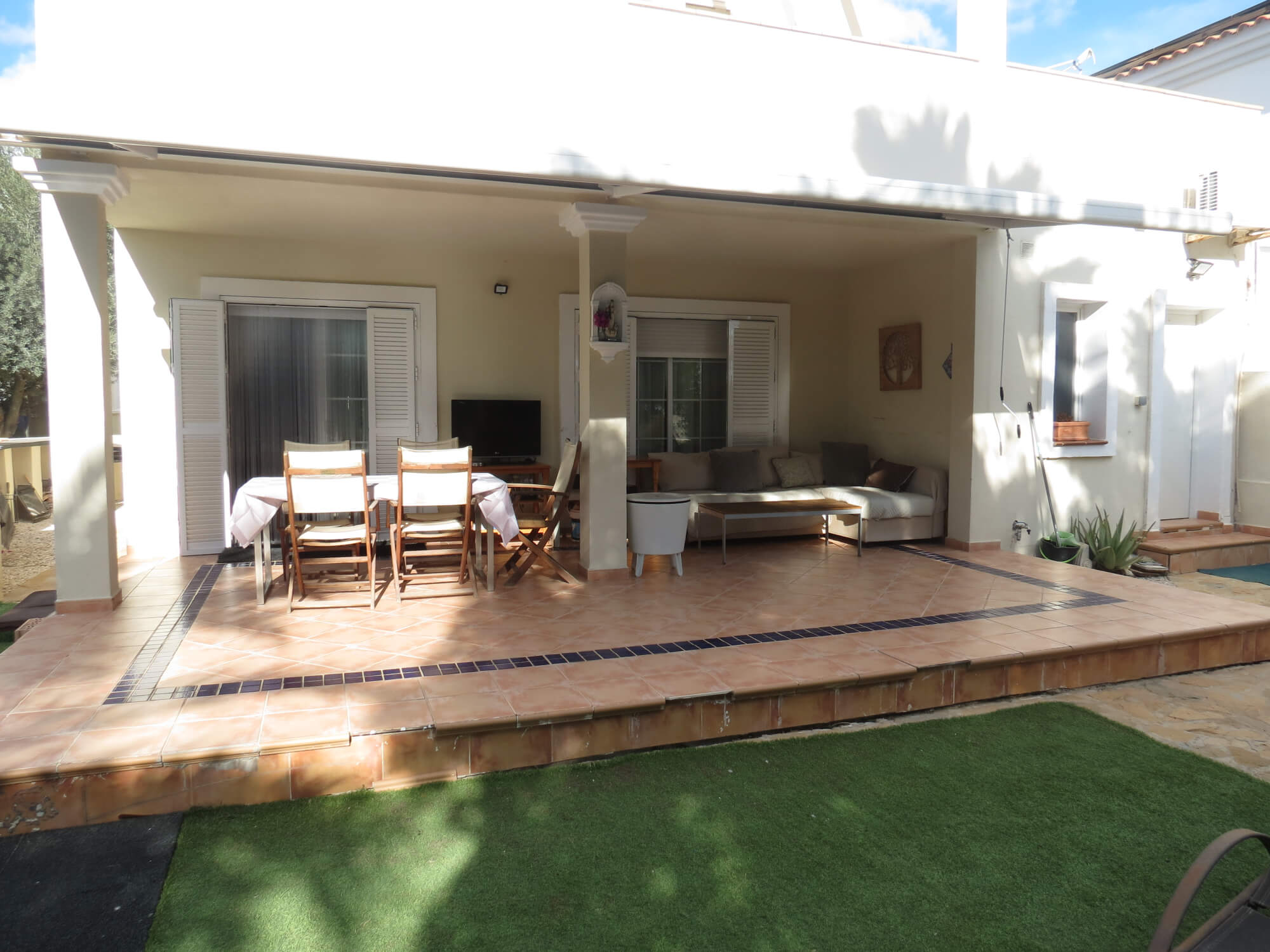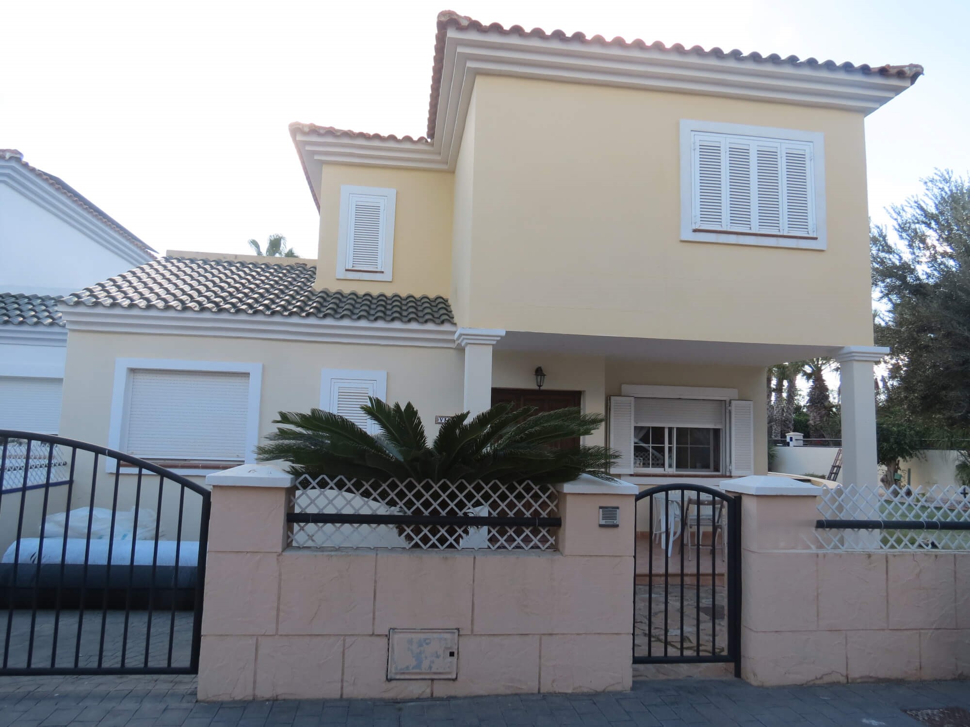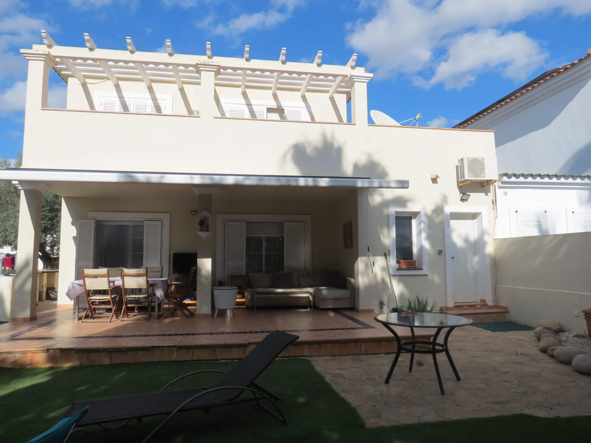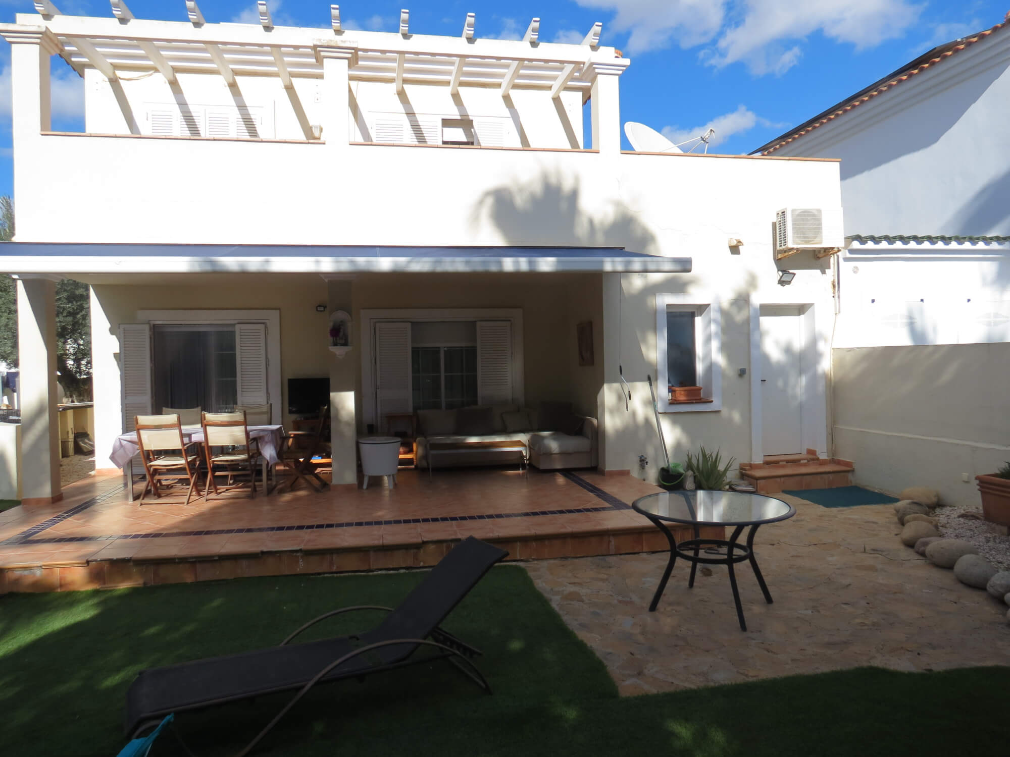 La vivienda tipo dúplex y en esquina, de 156 m2, está construida sobre una parcela de 577 m2. En ella nos encontramos en la primera planta recibidor, aseo, cocina totalmente amueblada y amplio salón comedor con acceso por una gran cristalera a la bonita zona del porche. Junto a la vivienda nos encontramos con una zona de servicio independiente a la vivienda principal que consta de un baño con ducha, un dormitorio y con aire acondicionado perfecto para recibir visitas.