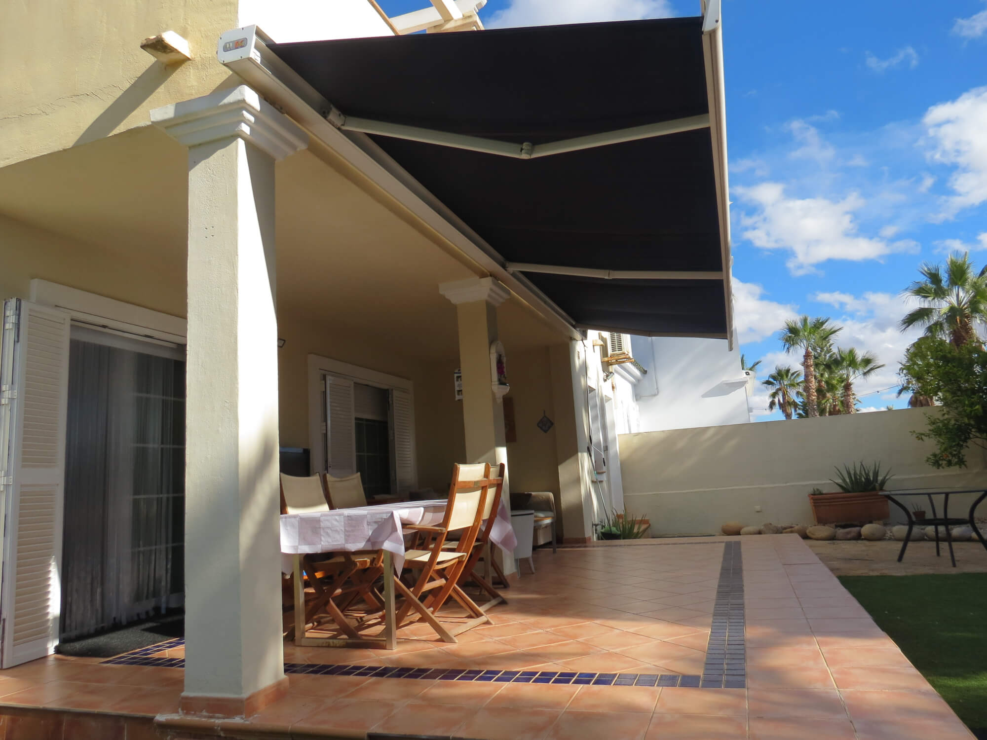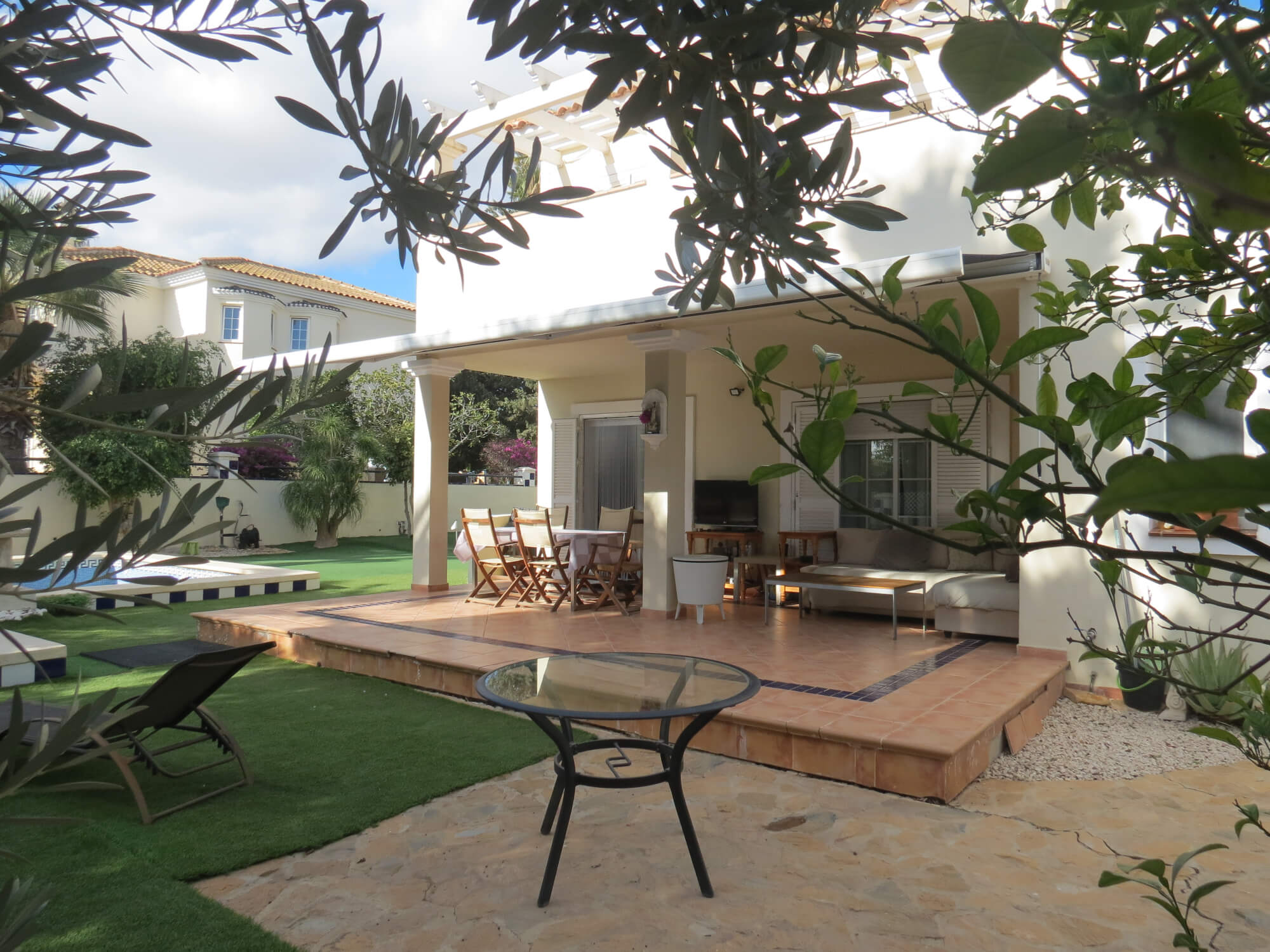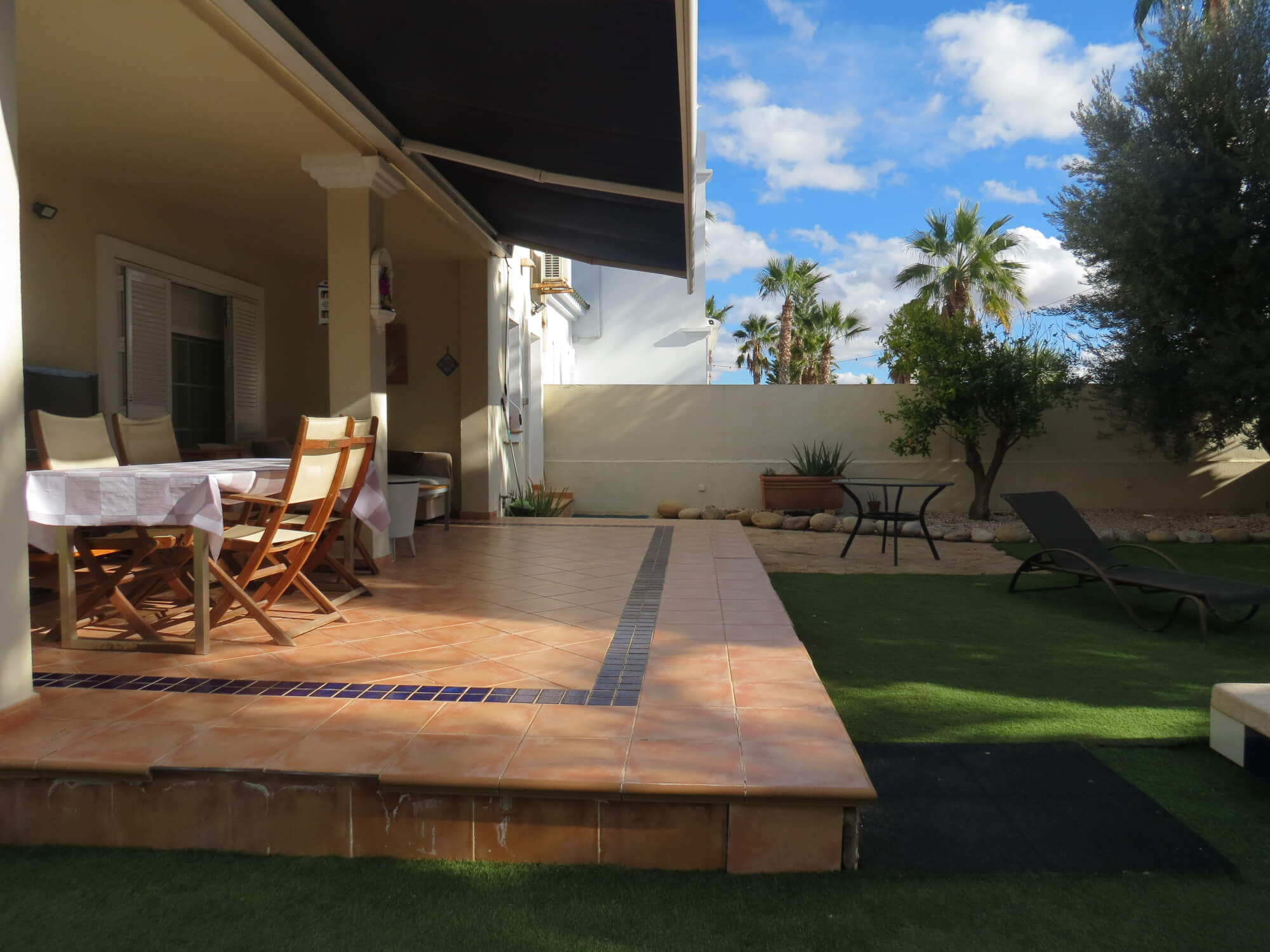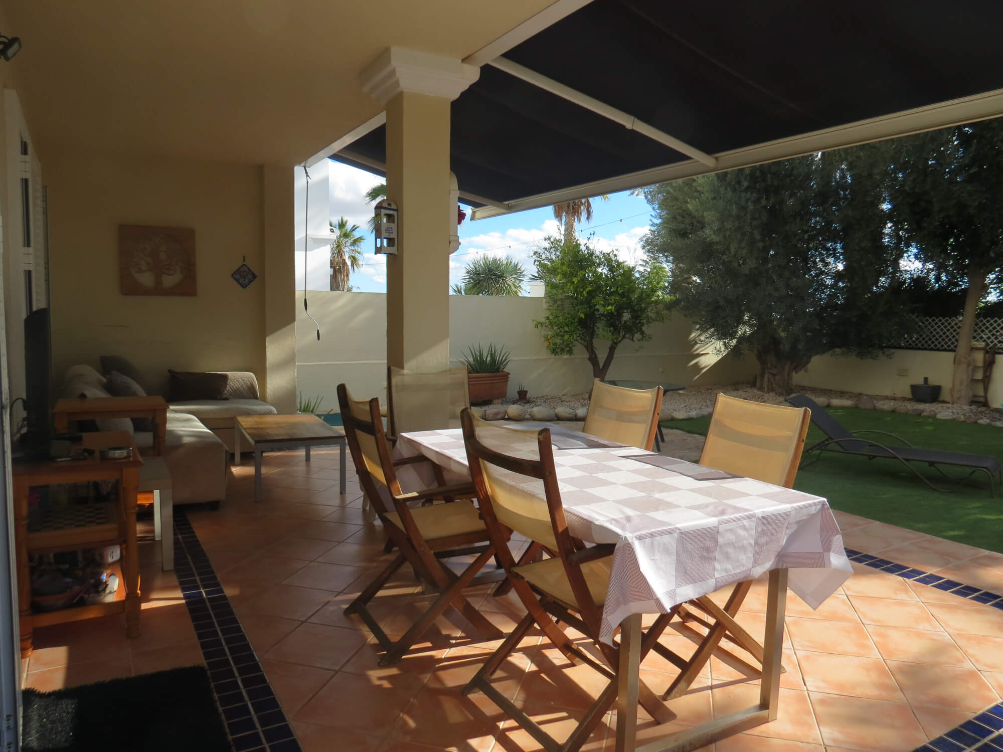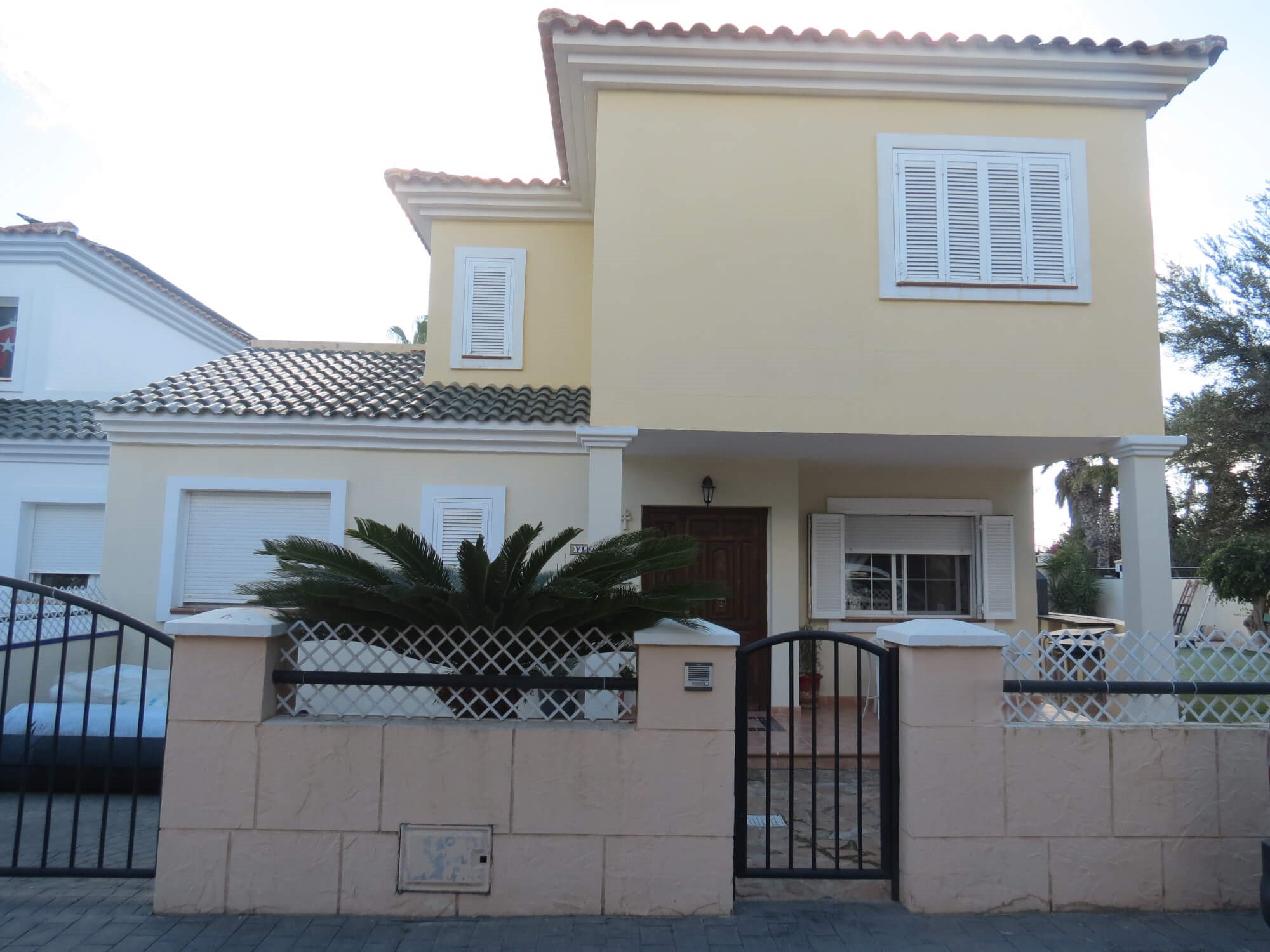 La vivienda tipo dúplex y en esquina, de 156 m2, está construida sobre una parcela de 577 m2. En ella nos encontramos en la primera planta recibidor, aseo, cocina totalmente amueblada y amplio salón comedor con acceso por una gran cristalera a la bonita zona del porche. Junto a la vivienda nos encontramos con una zona de servicio independiente a la vivienda principal que consta de un baño con ducha, un dormitorio y con aire acondicionado perfecto para recibir visitas.