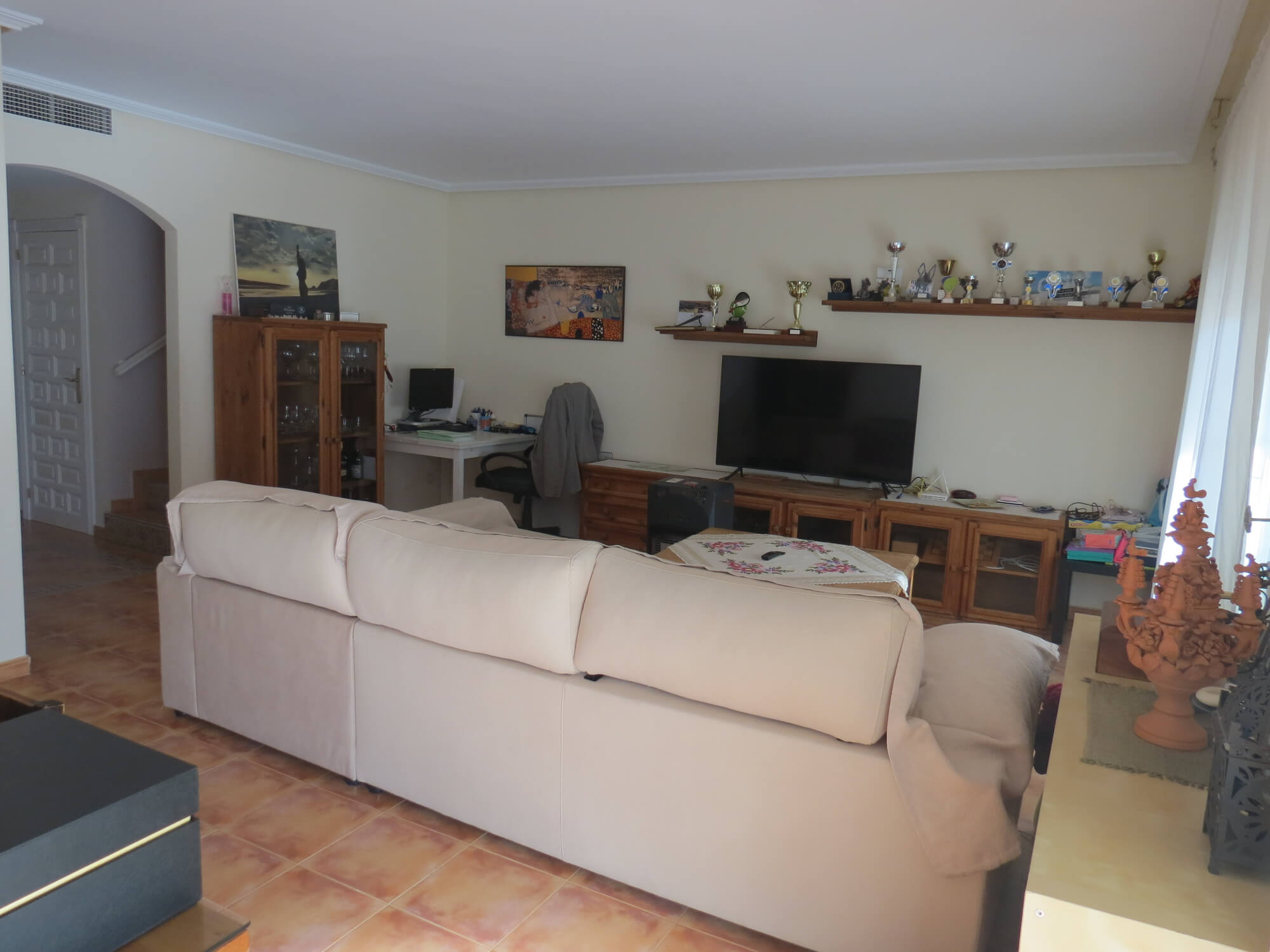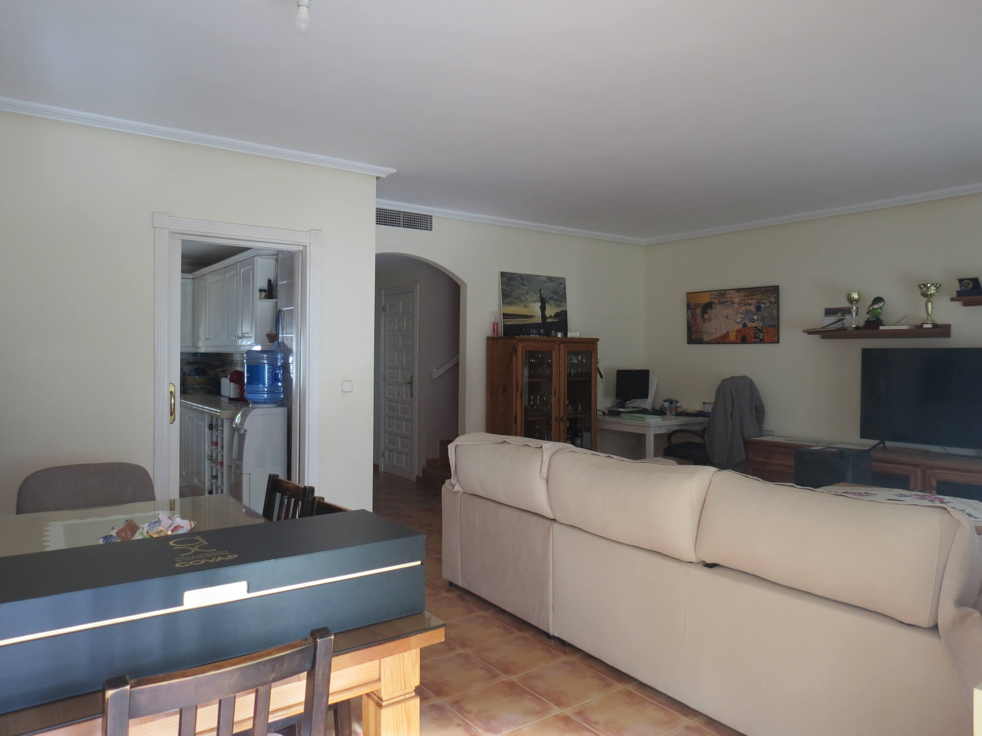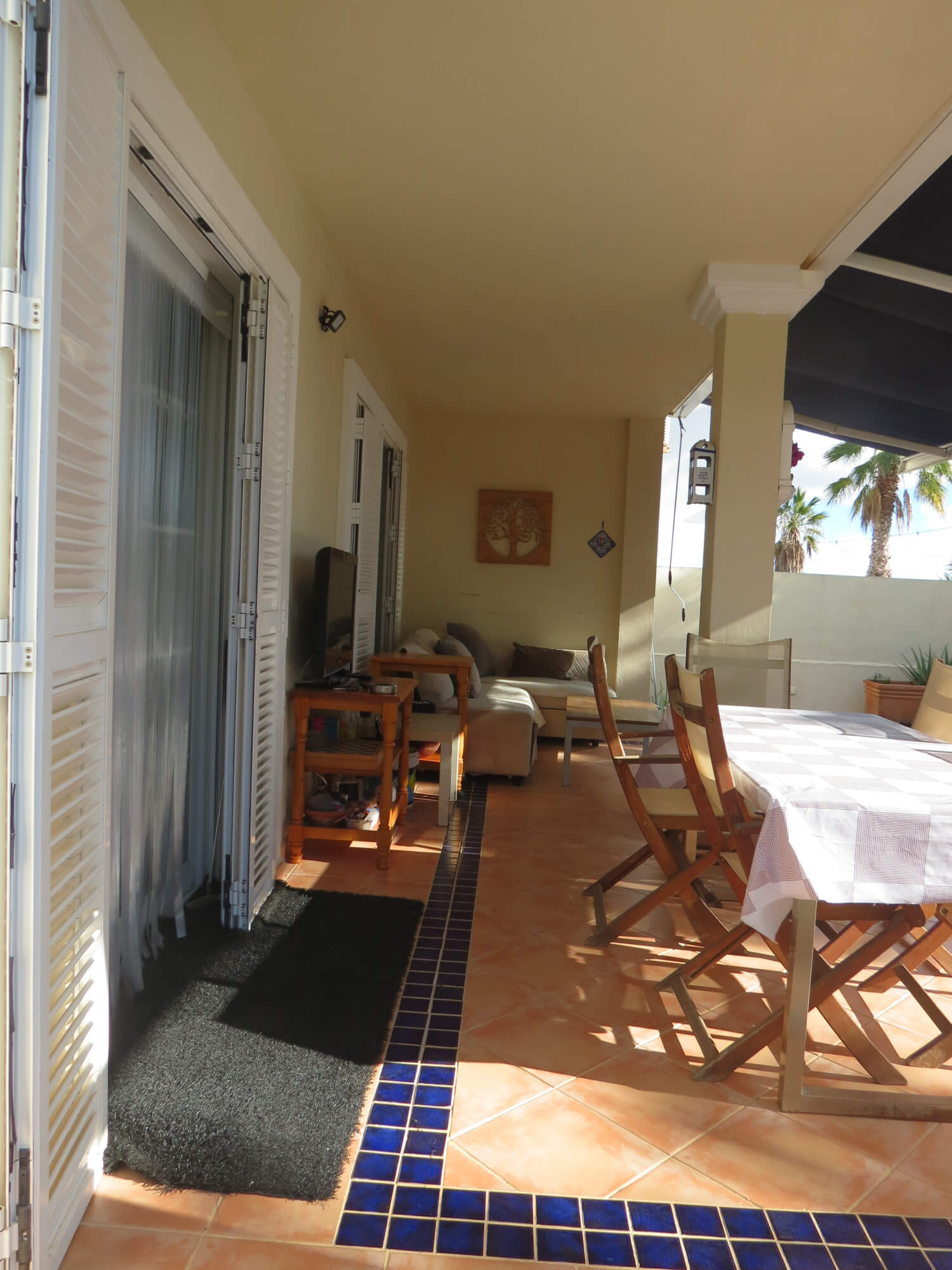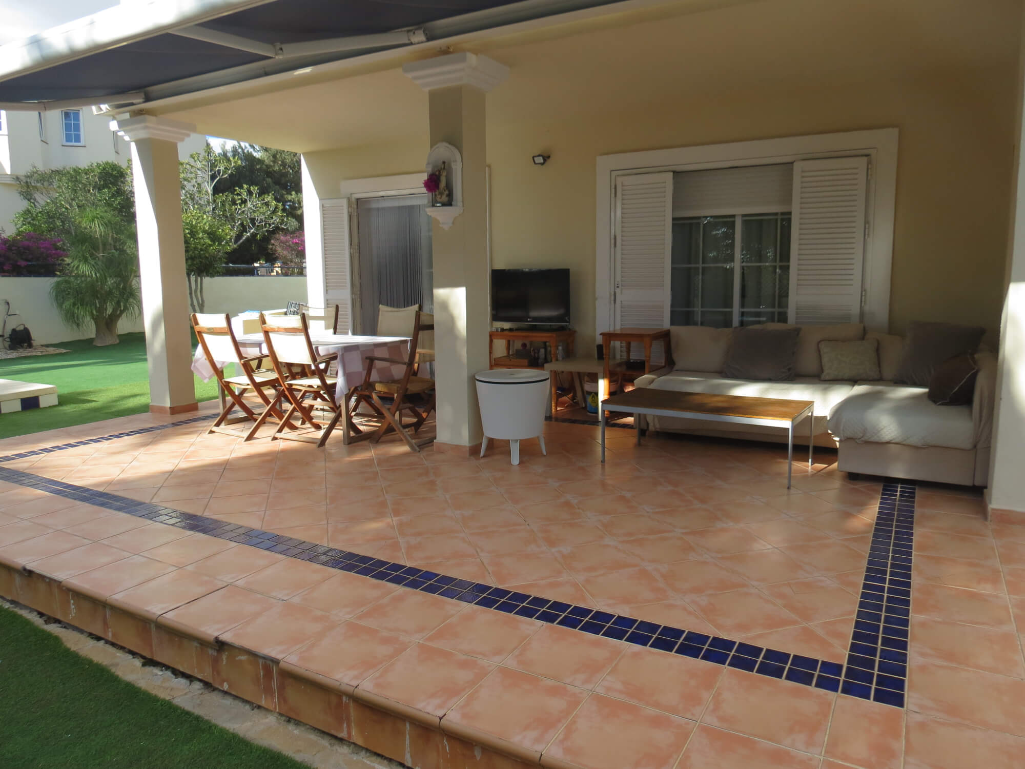 La vivienda tipo dúplex y en esquina, de 156 m2, está construida sobre una parcela de 577 m2. En ella nos encontramos en la primera planta recibidor, aseo, cocina totalmente amueblada y amplio salón comedor con acceso por una gran cristalera a la bonita zona del porche. Junto a la vivienda nos encontramos con una zona de servicio independiente a la vivienda principal que consta de un baño con ducha, un dormitorio y con aire acondicionado perfecto para recibir visitas.